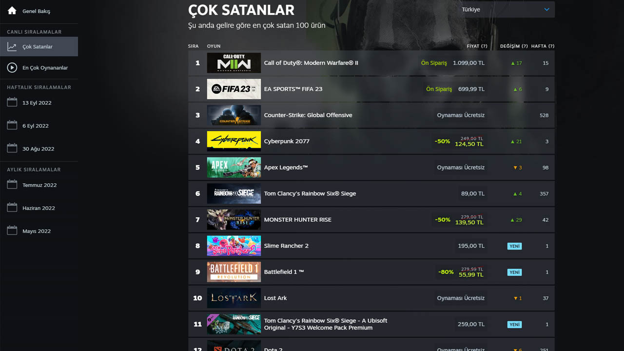 Steam Grafiklerinin en çok satan bölümüne girdiğimizde sağ üstte yer alan Ülke filtresi dikkatimizden kaçmıyor. Dünyadaki veya başka bir ülkedeki tüm Steam kullanıcılarını kapsayacak şekilde ayarlayabilirsiniz. Sol menüden en çok oynanan oyunlara anında göz atabilir veya son hafta veya ayların istatistiklerine ulaşabilirsiniz. Elbette oyunların anlık fiyatlarını bu sayfadan görebilirsiniz. Geliştiricileri, aylık sıralama sayfalarını çok eksiksiz ve işlevsel bir şekilde tasarladı. Öyle ki 2022 Temmuz istatistiklerini görmek istediğinizde o ayın en çok satan oyunları hakkında detaylı bilgi alabilir, popüler ücretsiz oynanan oyunların listesini inceleyebilir, en çok satan DLC’leri görebilir ve bloga erişebilirsiniz. geliştiriciler tarafından paylaşılan gönderiler.