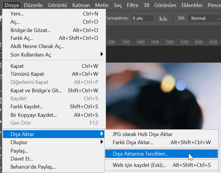 - Ardından Dosya > Dışa Aktarma > Dışa Aktarma Tercihleri adımlarını takip edin.