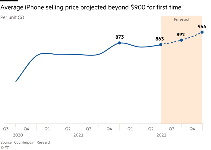 Counterpoint Research, iPhone modellerine yönelik yeni bir araştırma başlattı. iPhone 14 serisine yönelik küresel talebin artması ile daha fazla satış yapacak olan Apple, ortalama iPhone fiyatının da yükselmesini sağlayacak. 2021 yılının 4. çeyreğinde ortalama fiyat 873 dolardı. Gelecek yıllara yönelik tahminlerde ise fiyatın sırasıyla 892 dolar ve 944 dolar ile iki kez rekor kırması bekleniyor.