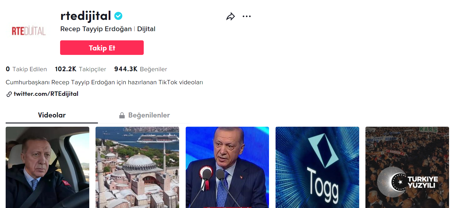 TikTok’ta ‘rtedijital’ olarak yer alan Cumhurbaşkanı Erdoğan’ın hesabında özel olarak hazırlanan videolara yer verildi. Açıklama kısmına ise “Cumhurbaşkanı Recep Tayyip Erdoğan için hazırlanan TikTok videoları” notu düşüldü.