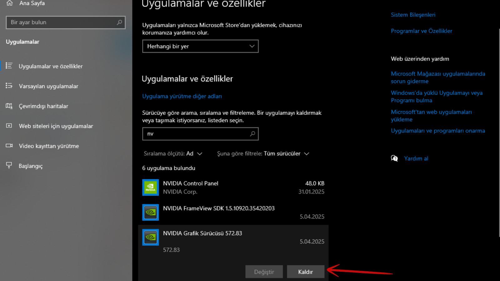 Geri dönme seçeneği pasifse ya da tamamen temiz bir kurulum yapılmak isteniyorsa, mevcut sürücünün kaldırılması gerekir. Üç farklı yöntem uygulanabilir: