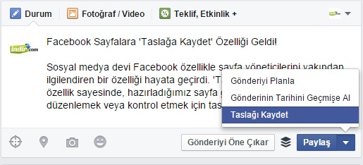 Hazırlanan gönderiyi sağ alt köşede bulunan ‘Paylaş‘ butonunun hemen yanındaki ‘ok‘ simgesine tıklayıp karşınıza çıkan ‘Taslağı Kaydet‘ butonuna tıklamanız yeterli oluyor. Sonrasında taslakların listelendiği sayfaya yönlendiriliyorsunuz.