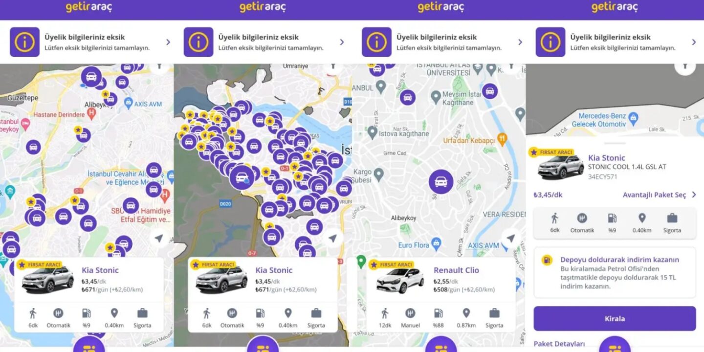 Getir, araç kiralama hizmetlerinin %75’ine sahip olan MOOV ile el sıkıştı. Fakat programa girdiğimizde aşağıda bir araç şeklinde yeni bir alternatifin olduğunu görüyoruz. Bu sayede artık araç kiralamak isteyen herkes uygun sürücü belgesine sahip olması şartıyla araç kiralayabilecek.
