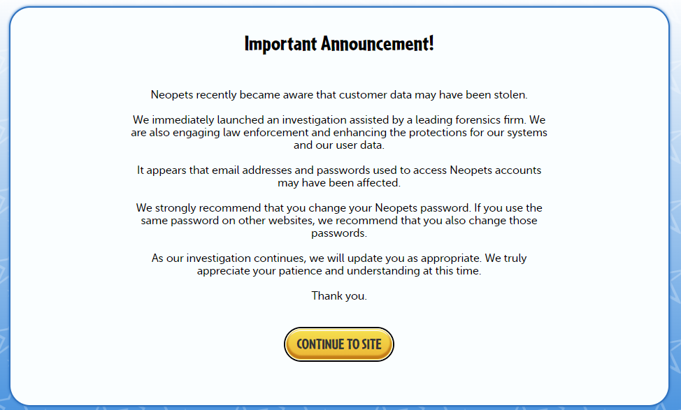Açıklamada ise “Neopets kısa süre önce müşteri verilerinin çalınmış olabileceğini fark etti. Konuyla ilgili olarak hemen soruşturma başlattık. Ayrıca kolluk kuvvetleri destekleriyle birlikte sistemlerimiz ve kullanıcı verilerimiz için koruma sistemlerimizi geliştiriyoruz. Neopets hesaplarına erişmek için kullanılan e-posta adresleri ve şifrelerin, saldırıdan etkilenmiş olabileceği anlaşılıyor. Neopets şifrenizi değiştirmenizi tavsiye ediyoruz. Aynı parolayı diğer web sitelerinde de kullanıyorsanız, bu parolaları da değiştirmenizi öneririz. Araştırmamız devam ettikçe, sizi bilgilendirmeye devam edeceğiz. Bu zamanda sabrınız ve anlayışınız için gerçekten teşekkür ederiz.” denildi.
