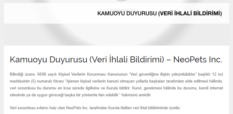 KVKK tarafından yapılan son duyuruda NeoPets Inc. üzerinden büyük bir veri sızıntısının yaşandığı belirtildi.