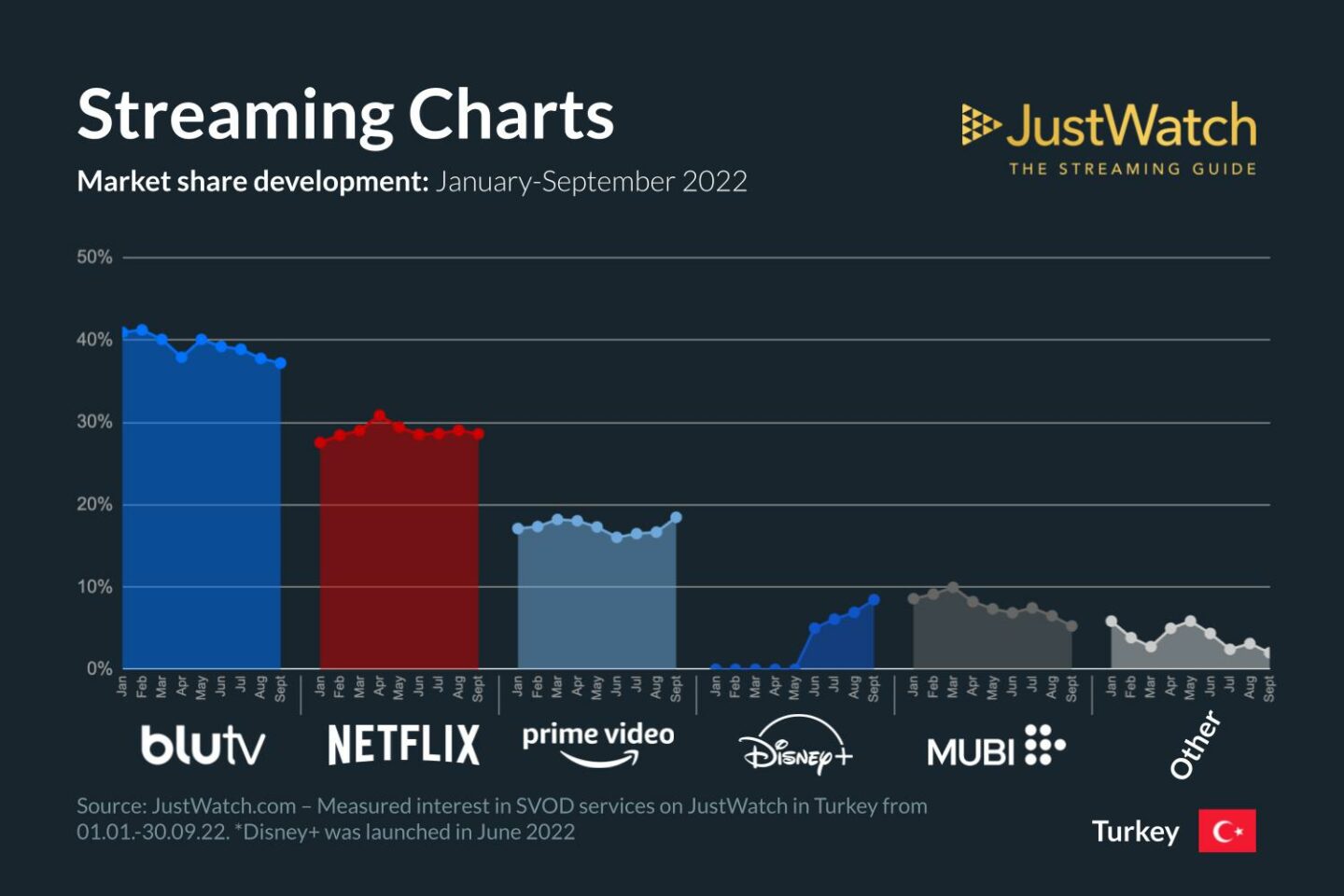 2022 yılı genelindeki pazar payında yine BluTV öne çıkıyor. Haziran 2022’de giriş yapan Disney Plus ise yüzde 8’lik bir artış yaşamayı başarmış durumda.