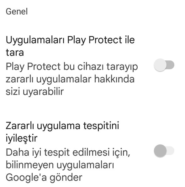 Belirtilen adımları takip ederek Play Protect’i pasif duruma getirebilirsiniz. Ardından ayarlarda şöyle bir görünüm oluşmalıdır.