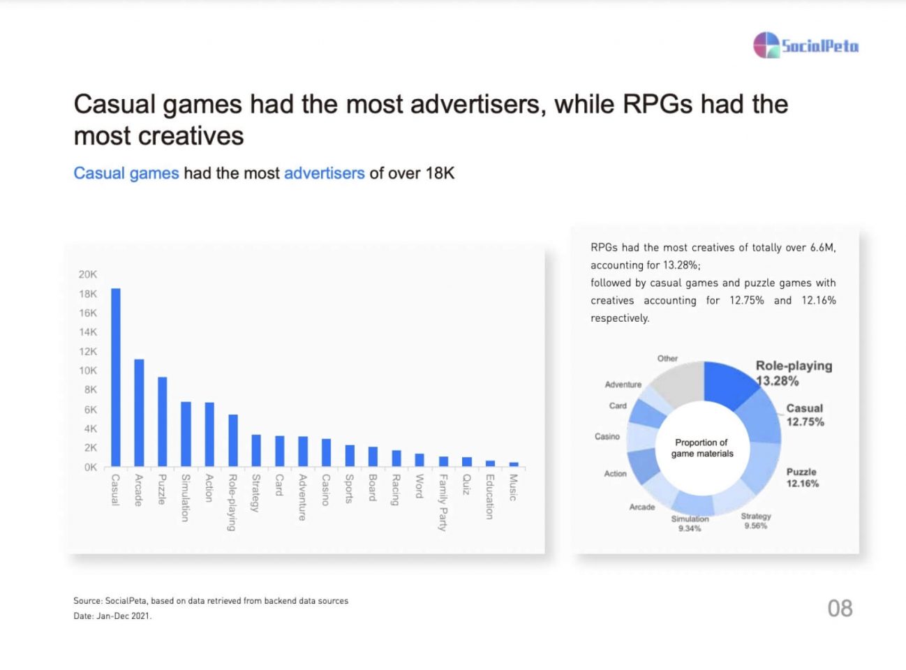 Casual oyunların 18 binden fazla reklamverene sahip olup en çok reklamveren içeren tür olduğu görülmüştür. Ayrıca RPG oyunlarının ise 6.6 milyon reklam ile en çok reklam verilen tür olduğu görülmüştür.