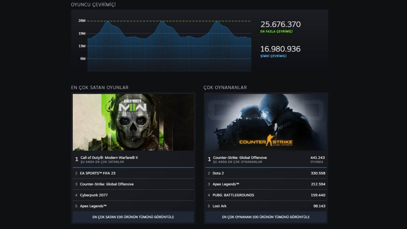 Steam’deki yeni sayfa, şu anda Steam’de kaç kişinin çevrimiçi olduğunu gösteriyor. Bu içerikte; 16 milyon 980 bin 936 oyuncunun online olduğu platformda en çok oyuncuya sahip olan oyun ise CS:GO. Şu ana kadar 441.000 243 kişi CS:GO oynuyor. En çok satanlar listesinin başında henüz piyasaya sürülmemiş olan Call of Duty: Modern Warfare 2’nin varlığını görüyoruz.