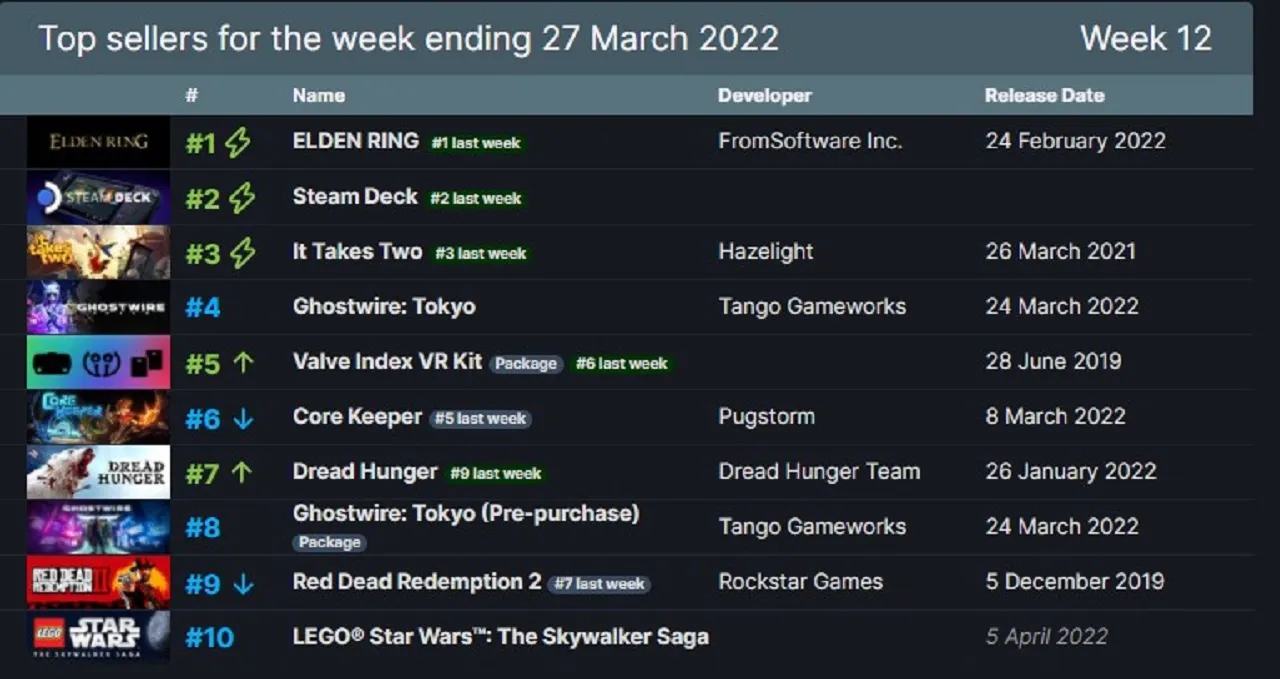 Valve’in elde taşınır konsolu olan oyunun aksine Steam Deck, geçen hafta Steam’in en çok satanlar listesinde ikinci sırada yer aldı. Üçüncü sırada ise 26 Mart 2021 tarihinde oyunculara tanıtılan It Takes Two yer alıyor.