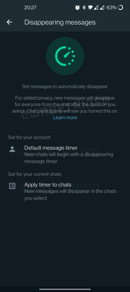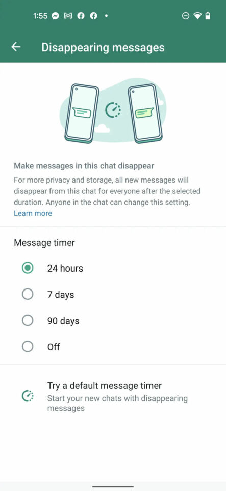 Yukarıdaki ekran görüntüsünde görüldüğü gibi, yeni kullanıcı ara yüzünde büyük bir zamanlayıcı ve hemen altında kaybolan mesajların ne olduğunu açıklayan bir metin var. Varsayılan Mesaj Zamanlayıcı’da, tüm sohbetler için mesajların süresinin dolması için sabit bir süre ayarlayabilirsiniz. Tekrar tekrar her paylaşımda bu süresi belirlemenize gerek yok. Aşağıda ise eski sürümü görebilirsiniz.