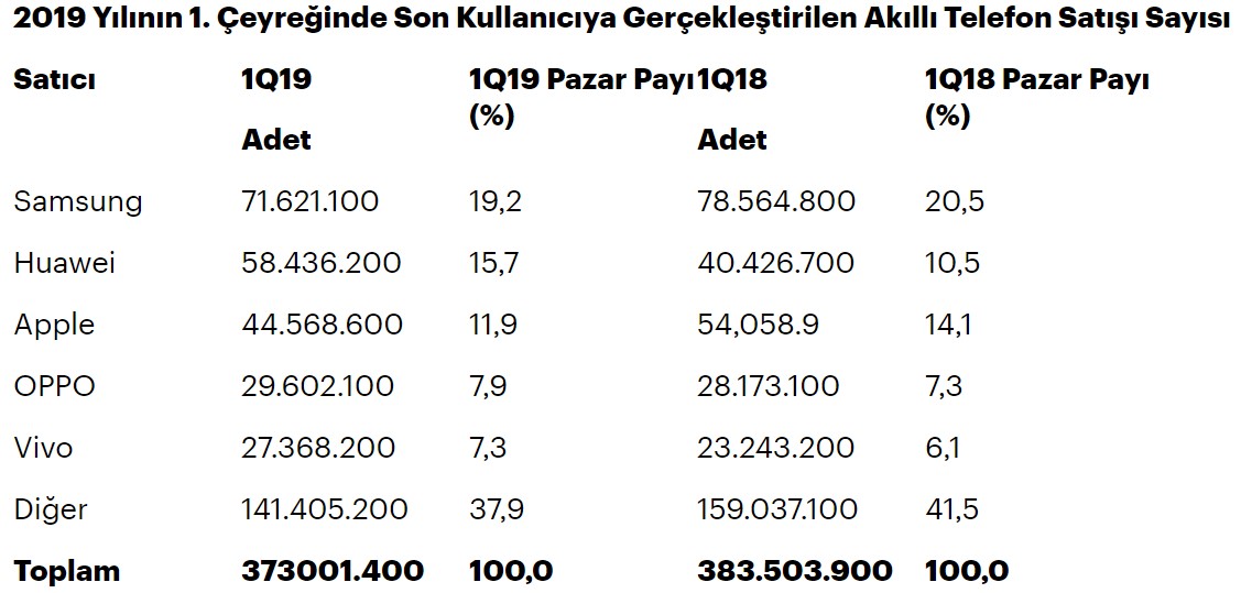 2019 ile beraber akıllı telefon sektörü genel satışlarda düşmeye devam ediyor. Küresel araştırma ve danışmanlık şirketi olan Gartner tarafından yapılan çalışmalar sonucunda 2019’un geride kalan ilk çeyreğinde 373 milyon adet akıllı telefon satışının gerçekleştiği ve bir önceki yılın aynı dönemine göre %2.7’lik bir düşüş olduğu gözüküyor. Özellikle son zamanlarda birçok marka ve şirket ile sorunlu olan Huawei ise 2019 yılının ilk çeyreğini en fazla satış yapan 2.marka olarak geride bıraktı.