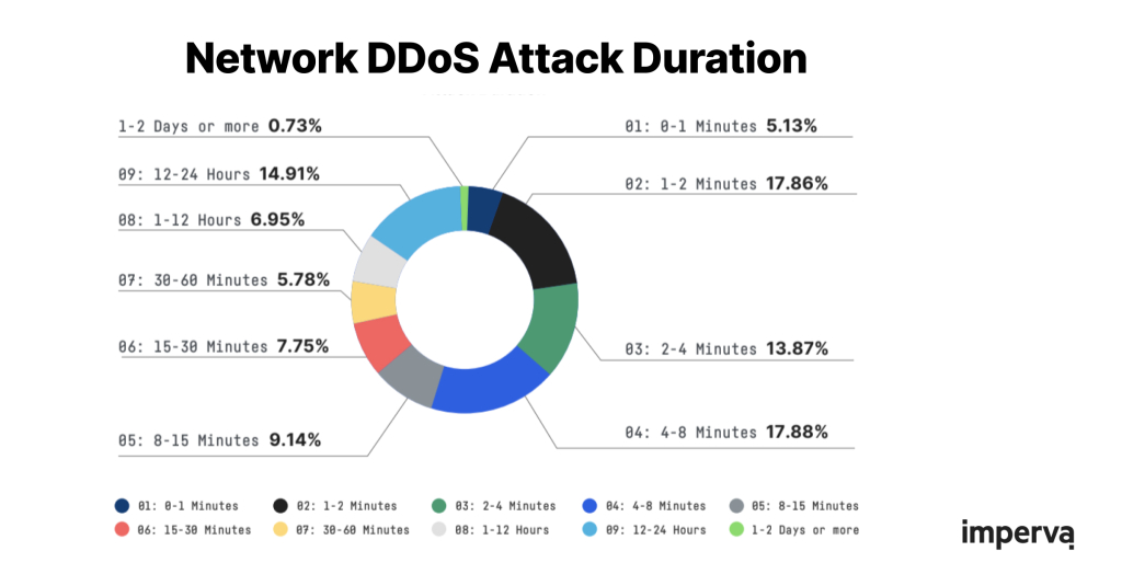 Imperva Research Labs'in araştırmasına göre, 2021'in ilk yarısında bir ağ DDoS saldırısının süresi sadece 6,1 dakikaydı. Organizasyonlar, dikkat dağıtma taktiği ve daha geniş bir çok vektörlü saldırının parçası olabileceğinden bu tür saldırılara karşı dikkatli olmalıdır.