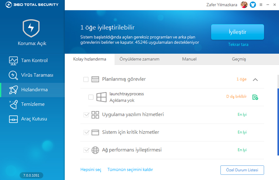 360 Total Security, bilgisayar sisteminizin performansını arttıracak bilgisaayr hızlandırma seçeneklerini de beraberinde getiriyor. Yazılımdaki 'Hızlandırma' bölümünde temel olarak bilgisayarın performansını düşürebilecek unsurların listesini görebilir ve bunların kolaylıkla ortadan kaldırılmasını sağlayabilirsiniz.