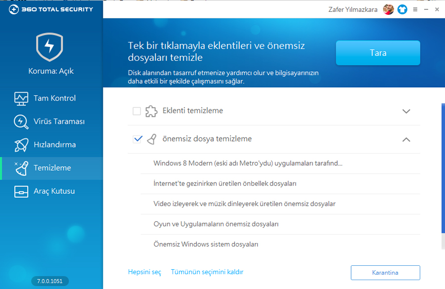 360 Total Security'de Temizleme sekmesini kullanarak sisteminizde bulunan gereksiz dosyaları kolaylıkla silebilir, sistem performansını arttırabilirsiniz.