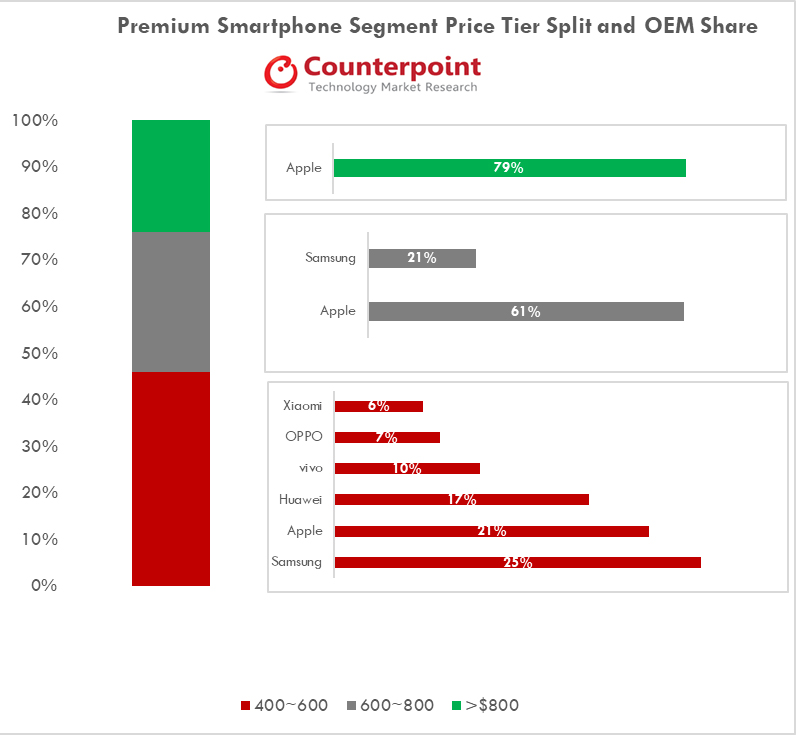 Alt sınıf Premium segmentine gelecek olursak ise 400 ve 600 dolar arası akıllı telefonlarda Güney Koreli şirket Samsung yüzde 25’lik Pazar payına sahip durumda. Apple ise yüzde 21 ile ikinci sıraya yerleşirken, üçüncü sırada yüzde 17 oranıyla Huawei bulunuyor. Geriye kalan yüzde 14’lük bölümü ise Oppo, Xiaomi ve diğer markalar oluşturuyor. Premium piyasaya 600 dolar ile 800 dolar arasındaki modellerin ortalamalarında Samsung yüzde 21 Apple’ın yüzde 61’lik oranı ile rekabetin bu iki marka arasında olduğunu ifade edebiliriz. Grafiklerde tüm detaylar yayınlanmış olmasa da Huawei Premium pazarda yüzde 12’lik bir orana sahip durumda. Çinli üreticinin 2018’i iyi rakamlar ile kapattığı bilinirken, bazı noktalarda Apple’ı bile geçtiği gözüküyor.