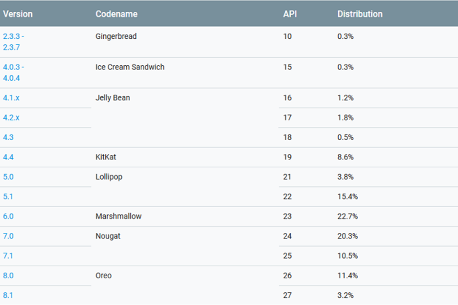 Yukarıda verdiğimiz tabloda yer alan bilgilere göre en çok kullanılan Android sürümü Nougat olduğu bize veriler gösteriyor. 7.0 ile 7.1 Android sürümlerinin toplamı %30,8’lik bir orana sahip olması ile bu senenin en çok kullanılan versiyonu olduğunu öğreniyoruz. Geçtiğimiz sene de en çok kullanılan srüm gene aynı sürümler çıkmıştı.