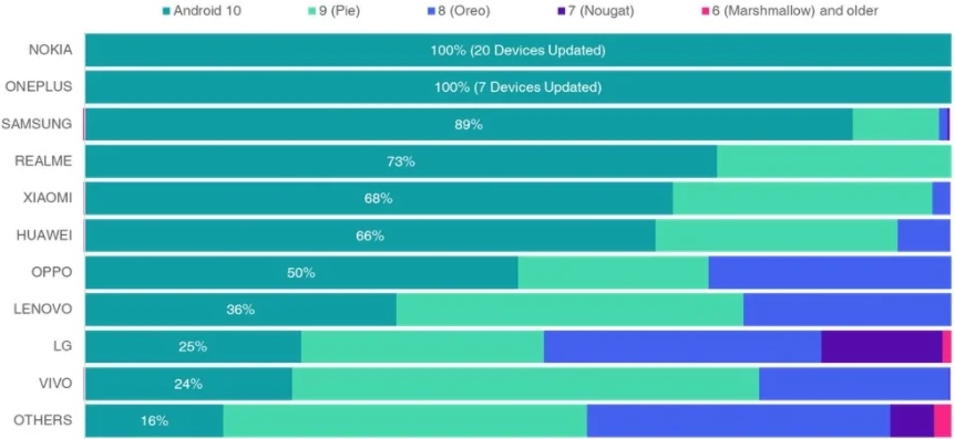 Counterpoint Reserarch’ün paylaştığı tabloya göre Nokia, pazardaki 20 akıllı telefonun tamamına Android 10 güncellemesi sunmuş durumda. Cihazların %100’üne güncelleme vererek zirvedeki yerini almış gözüküyor. OnePlus’ta cihazlarının hepsine güncelleme vermişken pazardaki akıllı telefon sayısından ötürü zirvede Nokia’yı görüyoruz. Gerek özellikleri gerekse güvenlik güncellemeleri ile eleştirilen Samsung ise pazardaki telefonlarının yüzde 89’una Android 10’a güncellemiş durumda. Listenin üçüncü sırasında yer alan Samsung haricinde Realme, Xiomi ve Huawei gibi isimler ise listenin devamındaki yerlerini almış oluyorlar.