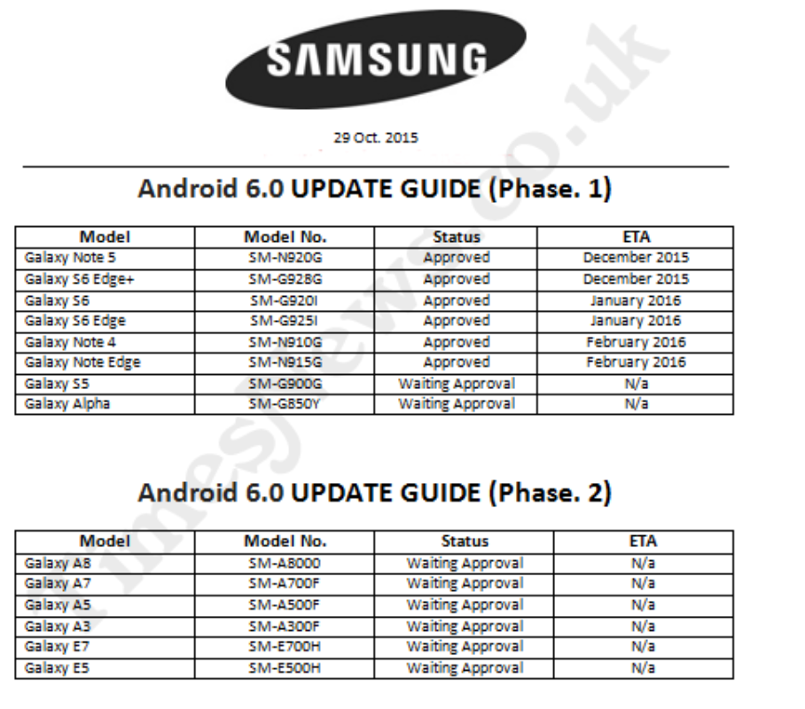 Takvime göre Galaxy S6 ve Galaxy S6 Edge modelleri Ocak 2016'da, Galaxy Note 4 ve Galaxy Note Edge modelleri Şubat 2016'da Android 6.0 güncellemesi alacak.