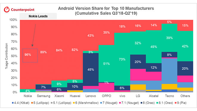 Google’ın sahip olduğu mobil işletim sistemi Android’in cihazlara güncelleme olarak ulaşması bazı zamanlar oldukça uzun sürebiliyor. Bu konuda Android ekosistemi bir süredir eleştirilirken, bu konuda en iyi olan telefon üretici markası belli oldu. Counterpoint tarafından gerçekleştirilen araştırmaya göre Android güncellemeleri noktasında en hızlı ve güncel olan ismin HDM Global olduğu ve Nokia serisi ile 2018 üçüncü çeyrekten beri satışa sunulan telefonların yüzde 96’sına Pie güncellemesi sunduğu ifade ediliyor. Şirket bu noktada açık ara bir şekilde lider olurken, ikinci sırada yüzde 89 oranı ile Samsung bulunuyor ve yüzde 84 ile Xiaomi şirketi üçüncü ve arkasında yüzde 82 ile Huawei bulunuyor. Bu noktada Nokia’nın hem yeni Android güncellemeleri hem de güvenlik güncellemeleri noktasında iyi bir performans sergilediği açık bir şekilde gözüküyor.