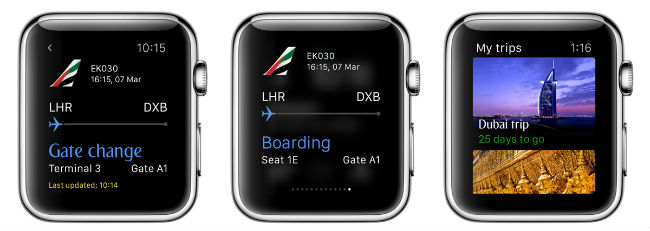 Emirates Havayolu, küresel çapta müşterilerine yüksek kalitede hizmet vermek amacıyla Apple Watch ile uyumlu uygulamasını duyurdu. Ortadoğu ve Afrika'da Apple Watch uygulamasına sahip ilk havayolu olan Emirates, bu hizmetini 24 Nisan 2015 tarihinde kullanıma sunacak.