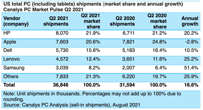 Listenin en üst sırasında yer alan HP, yüzde 21.9 pazar payı ile üst üste iki çeyrekte de birinci sırada yer almayı başardı. Amerika Birleşik Devletleri için büyük bir güce sahip olan Apple, tüm bu avantajlara rağmen ikinci sırada yer aldı. Sektörde yüzde 20.6 oranında bir paya sahip olan Apple sektör büyümesinde yüzde 2.8’lik bir düşüş kaydetmiş durumda. Üstelik ilgili çeyrekte düşüş yaşayan tek şirket de Apple.