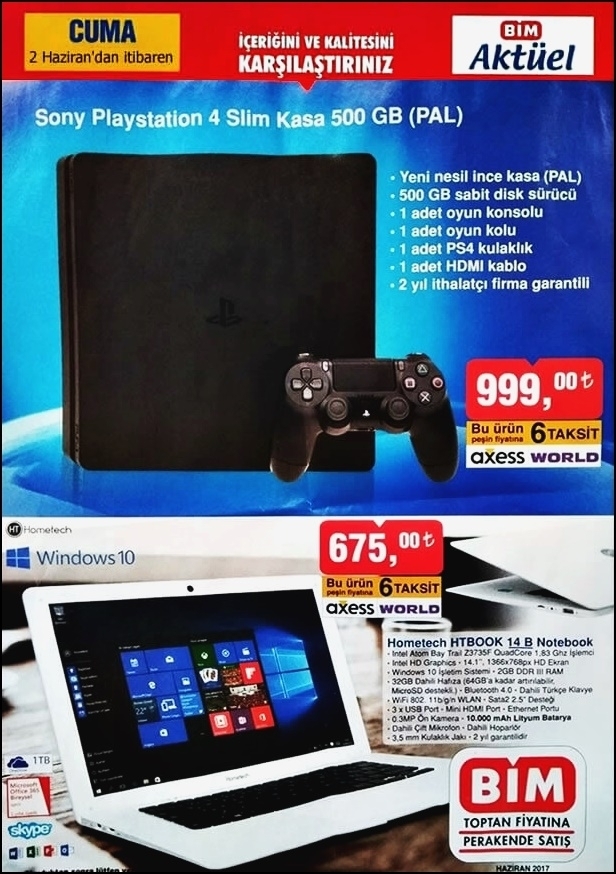 Geçtiğimiz yıldan itibaren bir süredir teknolojik ürünler getirerek, daha uygun fiyatlarla kullanıcılara ulaştıran BİM marketten yeni bir adım geldi. Verilen bilgilere göre kısa bir süre içerisinde BİM markette PS 4 satışı gerçekleştirilmeye başlayacak. Haber, marketin yayınlandığı katalogla elde edildi. Katalogda yer alan bilgilere bakıldığında PS 4 Slim sahibi olmak isteyenler 2 Haziran itibariyle konsolu marketten temin edebilecekler. Konsol için yine katalogda görülen fiyat ise 999 TL. BİM market daha öncesinde de PS 4 oyun konsolunu satışa çıkarmıştı ve yoğun bir ilgiyle karşılaşıldığı görülmüştü. PS 4 sahibi olmak isteyen oyuncular sabahın erken saatlerinde marketin önünde kuyruk oluşturmuştu. Aynı durumun 2 Haziran'da PS 4 Slim için de yaşanması bekleniyor.