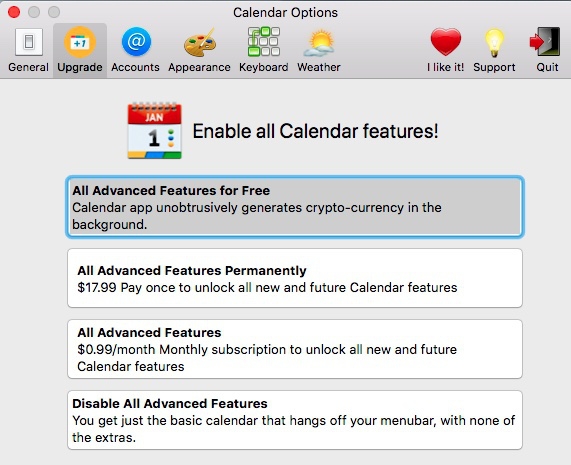 Kripto madencileri olan uygulamaların sadece internetteki çeşitli karanlık mekanlarda bulunabileceğini düşünebilirsiniz. Ama görünüşe göre durum böyle değil: görünüşe bakılırsa bazı yazılımcılar Takvim 2 adlı Mac takvimi için çıkarılan popüler bir alternatif, kısa bir süre önce Monero madenci yazılımı ile yeni bir güncellemeyi birleştirdi. Bu şekilde Premium özelliklerin kilidini açma imkanı yakalandı. iTunes'dan direkt olarak indirilebilen bu uygulamayı binlerce kişi kullandı. yani madencilik için kullanılan bir uygulama başka bir alanda da kullanılıp kilit kaldırmak için kullanılmış. Kişiler bu uygulamayı indirerek yeni bir madencilik vakasına mı kurban gidiyorlar yoksa olayın ardından başka bir gelişme mi çıkacak bilinmiyor.