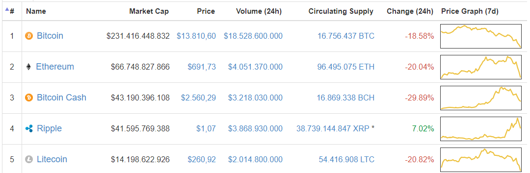 Düşüşe geçen tek isim Bitcoin değil ve diğer dijital para birimleride hızlı bir değer kaybetmeye başladı. Bir süre önce 650 milyar değerine erişen piyasa değeri bu haftadaki düşüş ile beraber 450 milyar dolara gerilemiş durumda. Bu sabah itibariyle 12.608 dolar rakamlarını göre kripto para birimi şuan için 13.421 rakamlarında geziyor. Birçok kullanıcı tarafından yatırım yapılan Bitcoin, genel piyasa değerine bakıldığında dijital paralar arasında büyük bir paya sahip durumda.