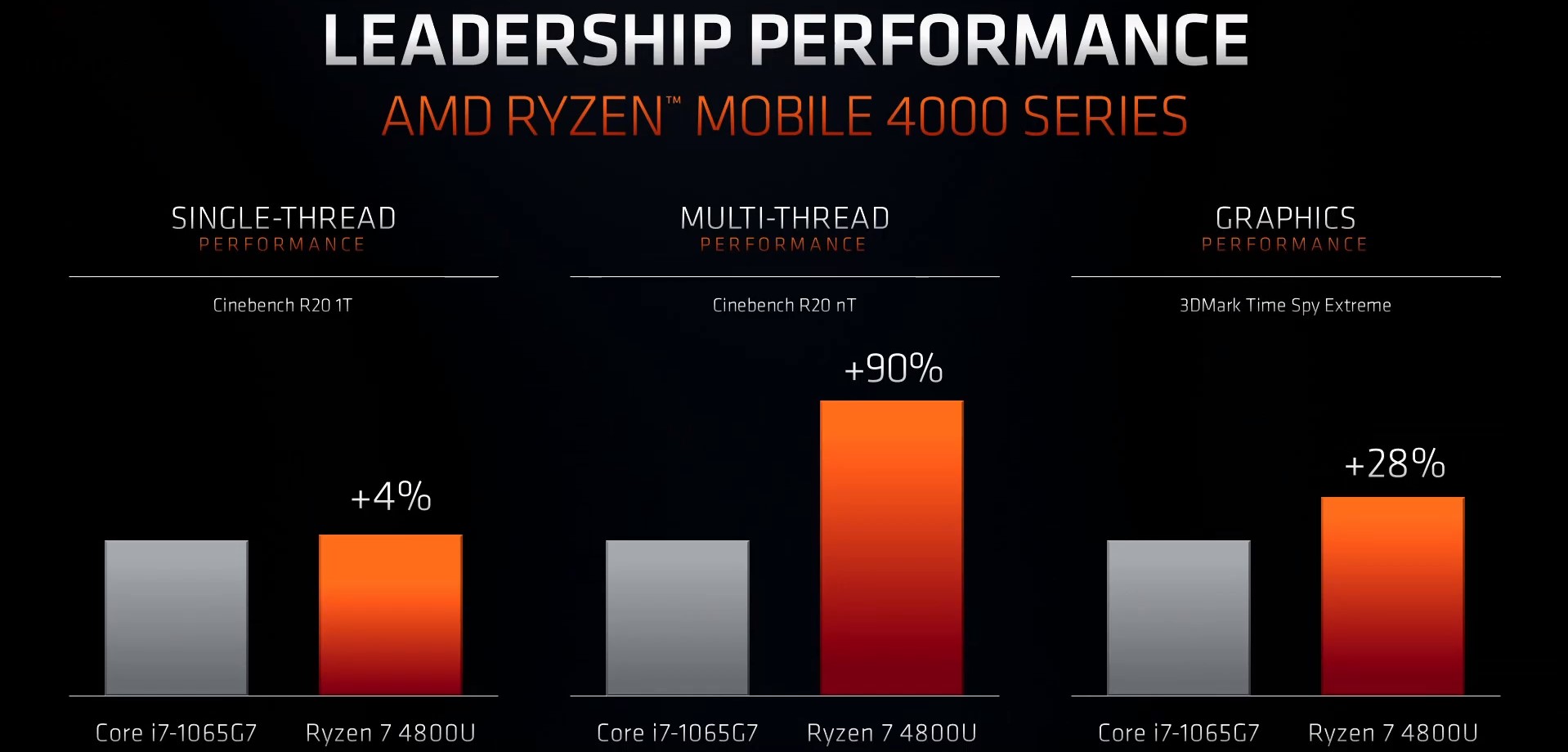 Tek çekirdek ile beraber çoklu çekirdek ve grafik performansları ile de rakiplerini arkada bırakan Ryzen 7 4800U modeli Adobe Premiere tarafındaki performansı ile en büyük rakibi olan i7 1065G7 modeline yüzde 49’luk bir fark atmayı başarıyor ve video düzenleme için tercih edilebilir ilk isim olmayı başarıyor. Şirket ayrıca 2020’nin ilk çeyreğinde Ryzen 4800U işlemcisine sahip dizüstü bilgisayar modellerinin pazarda olacağını da belirtiyor.