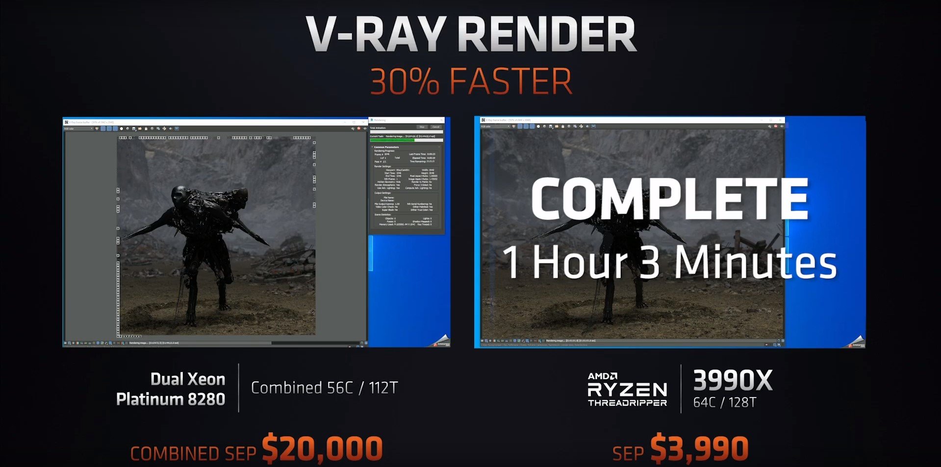64 çekirdek ile beraber 128 izleğe sahip olan AMD Ryzen Threadripper 3990X modeli merak edilen işlemciler arasında bulunuyor. 3990 dolar fiyat etiketine sahip olan bu işlemci Intel’In 20.000 dolar ile kurulan sistemine göre daha performanslı olmayı başarıyor. Ayrıca gösterilenlere göre 3990X işlemcisi ile yapılan bu işlem tam 1 saat 3 dakikada biterken. Intel’ın çift Xeon 8280 donanımına sahip cihazı ile işlem 1 saat 30 dakika sürüyor.