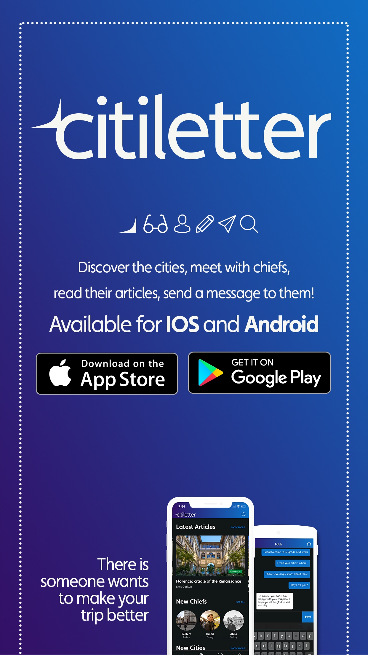 Citiletter, şehirlerin kültürünün, gündeminin, sorunlarının, mekanlarının, lezzetlerinin ve etkinliklerinin şefler tarafından makalelerle ele alındığı seyahat bazlı bir arkadaşlık uygulamasıdır. Gezginler, öğrenciler, Interrail gezginleri, blog yazarları, turistler, araştırmacılar ve vatandaşlar burada bir araya geliyor!