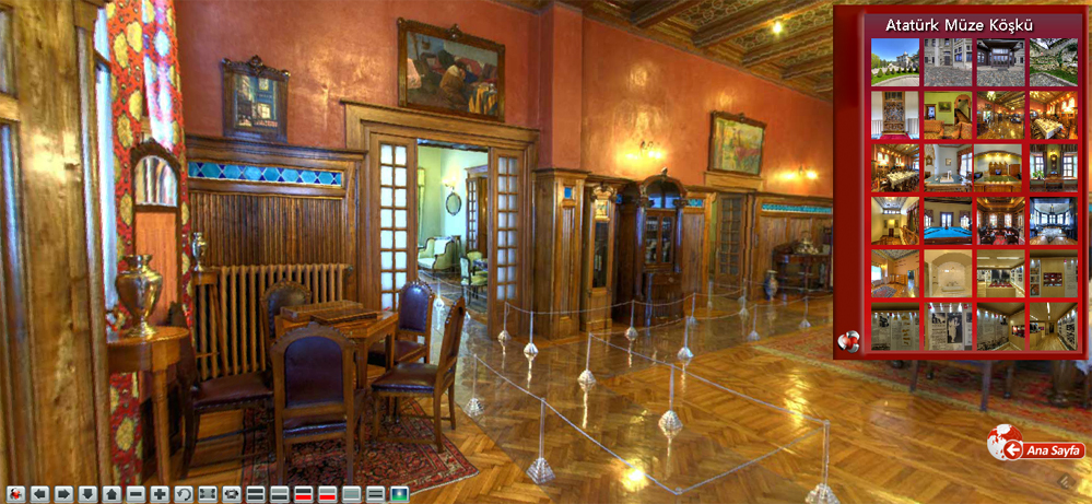Merdivenler, kabul salonları, yemek odası, ana tören alanı, basın salonu, konferans salonu, toplantı odası, personel odası, havuzlu bahçe ve önceki Cumhurbaşkanlarına kadar merak ettiğiniz bir çok mekanı 360 derece panoramik sanal tur ile ziyaret edebileceksiniz.