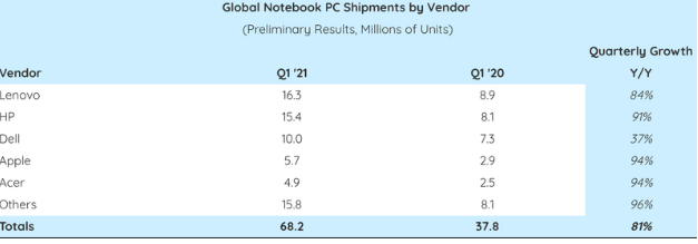 İlk çeyrek sonuçlarına göre ilk sırada Lenovo yer aldı. Dizüstü sektöründe önemli bir atılım gerçekleştiren marka hem iş hem de oyun sektöründe sunduğu modelleriyle büyük bir ilgi gördü ve bu durum da satışlara doğrudan yansıdı. Satışlarını % 94 oranında arttırmayı başaran Apple dahi listede ancak dördüncü olabildi Dell Lenovo'nun ardından gelen markalar HP, Dell ve Apple şeklinde olurken üç şirket de çeyrek boyunca 10 -16 milyon dizüstü bilgisayar sattı. Apple'ın bu çeyrekteki satışları 5,7 milyon olarak açıklandı. Bir önceki çeyrekte ise satışlar 2,9 milyon olarak açıklanmıştı. Bu bakımdan 2021 ilk çeyreğinde yüzde 94 artarken güçlü büyüme, evden çalışma nedeniyle Mac talebinden kaynaklanıyor. Apple'ın pazar payı geçen yıl yüzde 7,8 olurken, yeni çeyrekte yüzde 8,4'e yükseldi. Lenovo ve HP, eğitim sektöründe güçlü bir büyüme kaydeden Chromebook'ların yanı sıra Windows işletim sistemli dizüstü bilgisayarlarıyla pazar liderliğini sürdürdü.