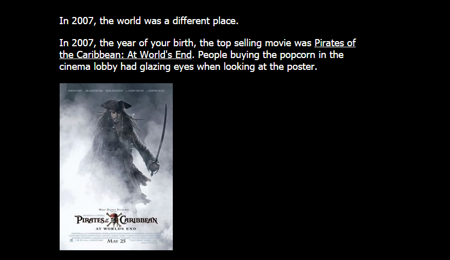2015 yılından geri sayım yapan site, bir süre sonra size sorguladığınız (doğduğunuz) yıl uluslararası politika durumunu, Oscar ödülü kazanan filmleri, o yıl çıkan oyunların neler olduğunu, müzik dünyasının trendlerini ve çok daha fazlasını size hikaye olarak sunuyor.