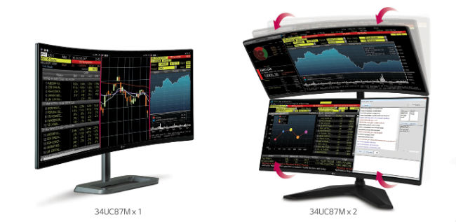 21:9 Kavisli UltraWide Multi Display (Model 34UC87M) birçok farklı çoklu görüntü ayarı seçeneği sunarken, borsacılar ve birçok veriyi aynı anda takip etmek isteyen tüm finansal profesyonellerin üretkenliğini artırıyor. Bir borsa işlem iş istasyonu ya da tablolar, fiyatlandırmalar ya da bekleyen siparişleri her bir ekranda gösterebilecek gibi kullanılabilen monitör, kullanıcıların fırsatları keşfetmesine olanak tanıyor.