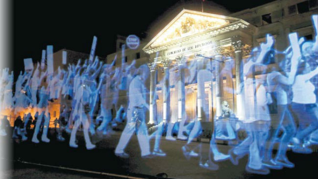 İspanyol halkı son dönemde çıkan Gag Kanunu'na göre izinsiz toplantı ve sokak gösterilerine para cezası veya hapis cezası vermeyi içeriyor. Bunun üzerine vatandaş Hologram tekniğini kullanarak bu yasayı protesto ederek çiğnemiş oldu.