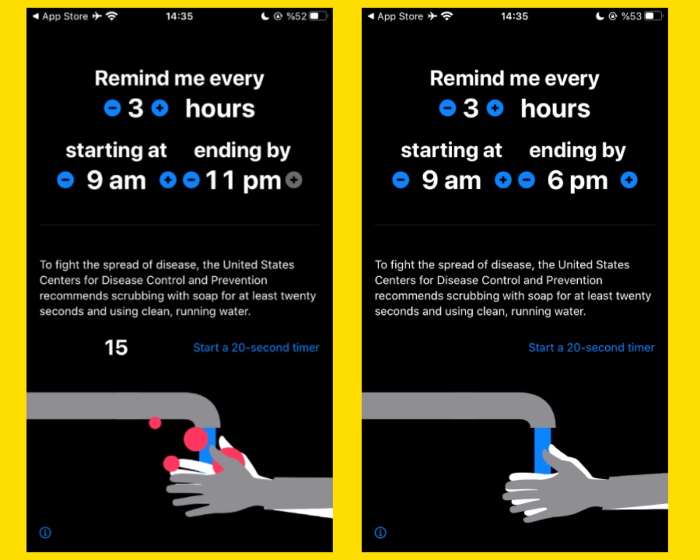 Bu konunun önemi görsel ve yazılı medyada sık sık vurgulanarak bireylerin sık sık el yıkamaya önem vermesi amaçlanıyor. Bu hem sizin, hem de çevreniz için büyük bir önem taşımakta. En iyi hijyen yolunun sabun olduğunu vurgulayan uzmanlara yardımcı olmak için bir mobil uygulama geliştirildi. App Store’da yayınlanan Wash Your isimli uygulama kullanıcılara belirli saat aralıklarında bildirim göndererek ellerini yıkamaları gerektiğini hatırlatıyor. Ayrıca uygulama bu bildirimle birlikte kullanıcılara 20 saniye kuralını da hatırlatıyor. Uygulamada bulunan sayaç sayesinde ise kullanıcılar ellerini sabunla yıkadıkları sürenin 20 saniyeyi doldurup doldurmadığını kolayca kontrol edebiliyor.
