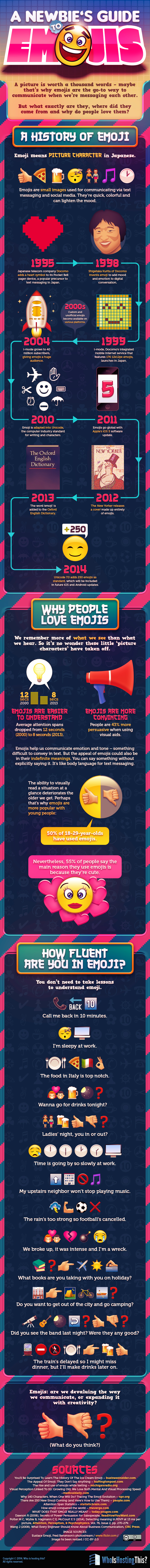 Yeni nesil internet kullanıcıları emoji'nin ne olduğunu ve ne için kullanıldığını biliyor. Ancak WhoisThisHosting eski internet kullanıcılarının emoji'leri daha yakından tanıması ve onları anlamalarını sağlayacak 'emoji tarihi' başlıklı bir infografik paylaştı.