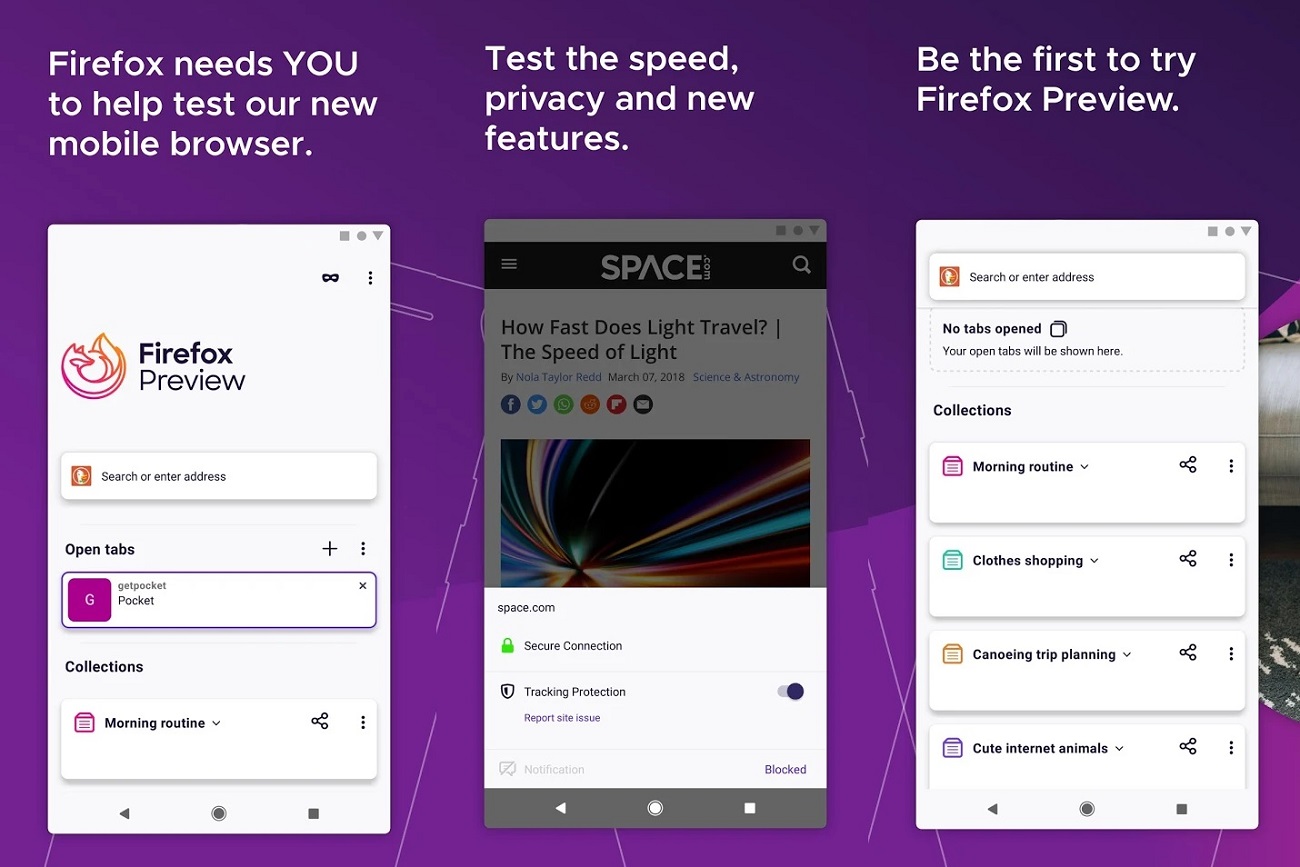 Google Chrome, Canary Google Chrome için ne ifade ediyorsa, Firefox Preview’de Mozilla için aynı şeyi ifade ediyor. Firefox tarayıcısının Android platformuna gelecek olan herhangi bir özellik ilk olarak Firefox Preview tarayıcısı üzerinde test ediliyor. Söz konusu bu tarayıcı Mozilla’nın eski sürümlerine göre çok daha hızlı bir sistem üzerinden çalıştığı söylenen Gecko View’u kullanmayı tercih eden bu tarayıcı bunun yanı sıra aynı zamanda izleme korumasını da kullanıcılara sunarak daha güvenli bir kullanım sunuyor.
