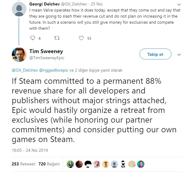 Epic Games CEO'su ise Steam'e twitter üzerinden bir teklifte bulundu. Steam'in oyun komisyonlarını kendileri gibi yüzde 12'ye çekmesi durumunda özel oyunlardan vazgeçeceklerini söyledi. Bu çıkış Epic Games'in kısa zaman içerisinde oyun piyasasında ne kadar güçlendiğinin de bir kanıtı. Bu durum karşısındna Steam nasıl bir yaklaşım izleyecek bu da merak edilen konular arasında.