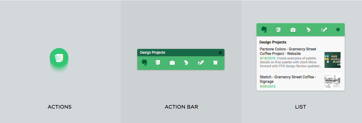 Bunun yanında Actions, Action Bar ile List olarak üç yeni widget eklenen Evernote uygulamasında, 1x1 boyutuna sahip Action widget'i hızlı not alınmasını, kamera ve arama servislerinin anasayfa üzerinden hızlı bir şekilde gerçekleştirilmesini, 4x1 boyutundaki Action Bar 11 farklı aksiyon seçenekleri sunuyor.