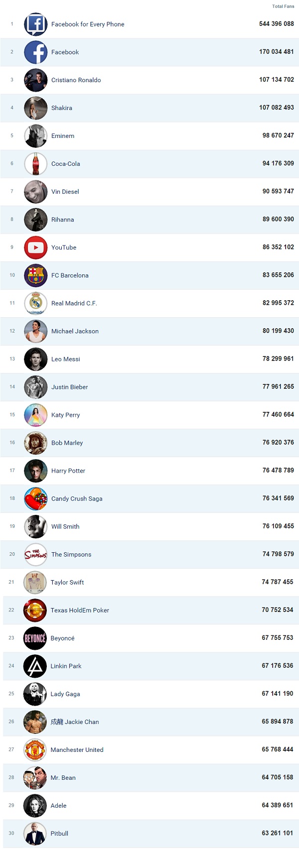 Facebook'ta en fazla beğeniye sahip 30 sayfanın tam listesi şöyledir;