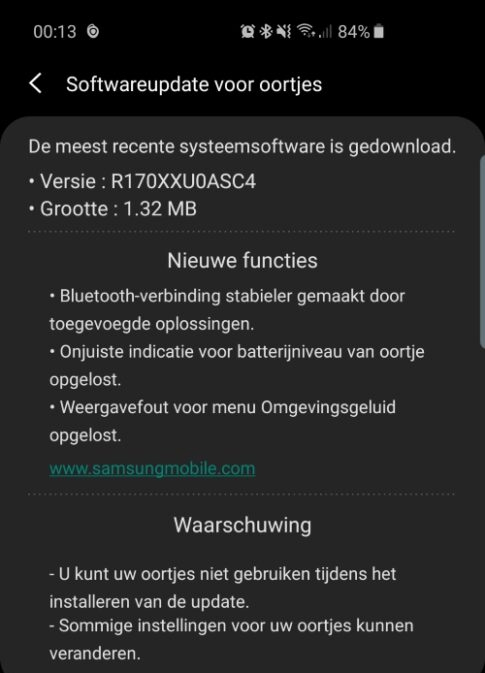 Galaxy Buds güncellemesi, 1.32 MB büyüklüğünde. Güncelleme konusunda bazı detayları da paylaşan Samsung, cihazlarda yaşanan pil seviyesi hatalarını gidermiş durumda. Pek çok kullanıcı tarafından da hata olarak bildirilen pil seviyesinin yanlış belirtilmesi, Galaxy Buds güncellemesi ile birlikte ortadan kalkmış durumda.