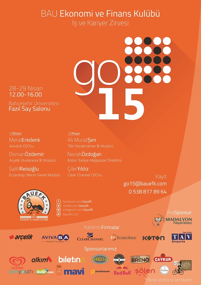 BAU Ekonomi ve Finans Kulübü tarafından bu yıl 3'ncüsü düzenlenecek olan 'İş ve Kariyer Zirvesi' GO'15 (Growing and Organizing in Business 15) 28-29 Nisan tarihlerinde BAU Beşiktaş Kampüsü'nde gerçekleştirilecek.