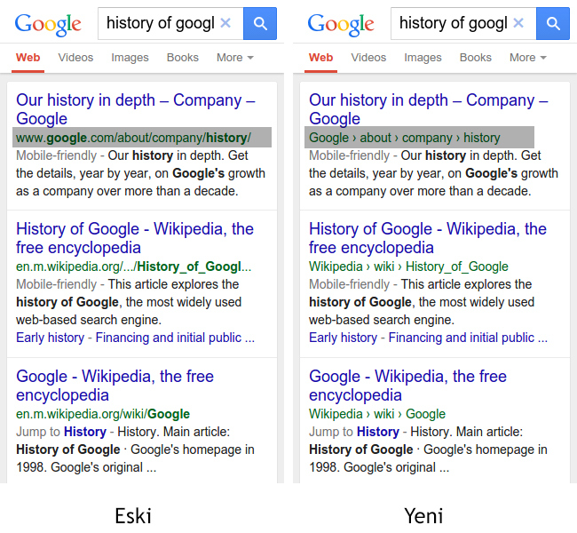 Google, Webmaster Central Blog üzerinden yaptığı açıklamada mobil cihazlarda arama sonuçları ekranını yenilediğini belirtti. URL gösteriminde yaptığı değişiklik ile yeni görüntüsüne kavuşan arama sonuç ekranı 2 yeni güncellemeyi beraberinde getirdi.