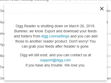 Digg varlığını sürdürmeye devam edecek, ancak Reader bölümü emekli oluyor. nedeni olarak da, RSS okuyucular tam olarak kar getirmemesi gösteriliyor. Her şeyden çok bir kamu hizmeti gibi varlığını sürdürüyor bu tür programlar. Ayrıca kullanıcıların Twitter, Facebook gibi alternatif kaynakların akışlarını takip etmesi de, bu tarz Reader ekiyle gelen uygulamaların kullanımına gölge düşürüyor. Kullanıcılar daha çok, popüler kültürün bir sonucu olarak karşımıza çıkan ve daha geniş kitleye hitap eden kaynakları tercih ediyor gibi görünüyor.