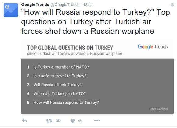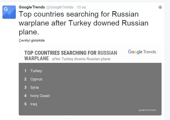 24 Kasım günü ülkemizde sınır ihlali yaptığı gerekçesiyle Su-24 adlı Rus uçağının düşürülmesi tüm dünyada büyük yankı uyandırdı. En çok konuşulan konular arasına giren bu olay sonucunda Türkiye, Google üzerinden en çok aratılan oldu.