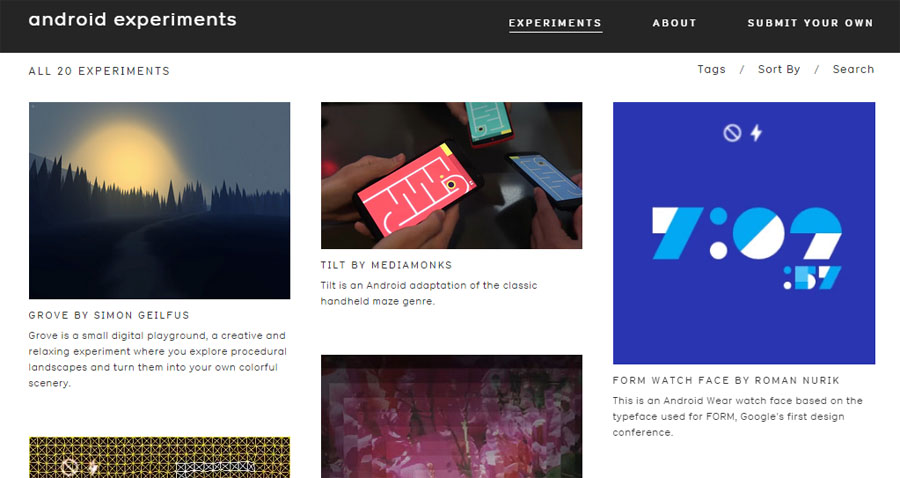 Android ile insanlar fikirlerini bir araya getirip, yeni yaratıcı projeler yapabiliyorlar. Android Experiments ile birlikte geliştiriciler için ilham kaynağı olabilecek projelerin tek bir sayfa altında toplanabilmesi sağlanmış.