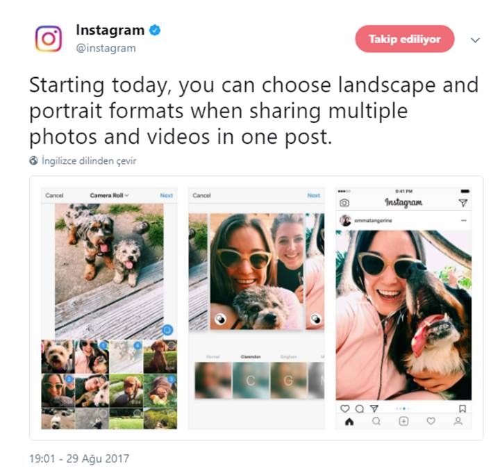 Instagramda son getirmiş olduğu güncelleme ile birlikte 16:9 ve 4:3 oranındaki dikey ve yatay resimler de albüme eklenebiliyor olabilecektir. Önceden de olduğu gibi en fazla 10 adet fotoğrafa sınırı devam ediyor.
